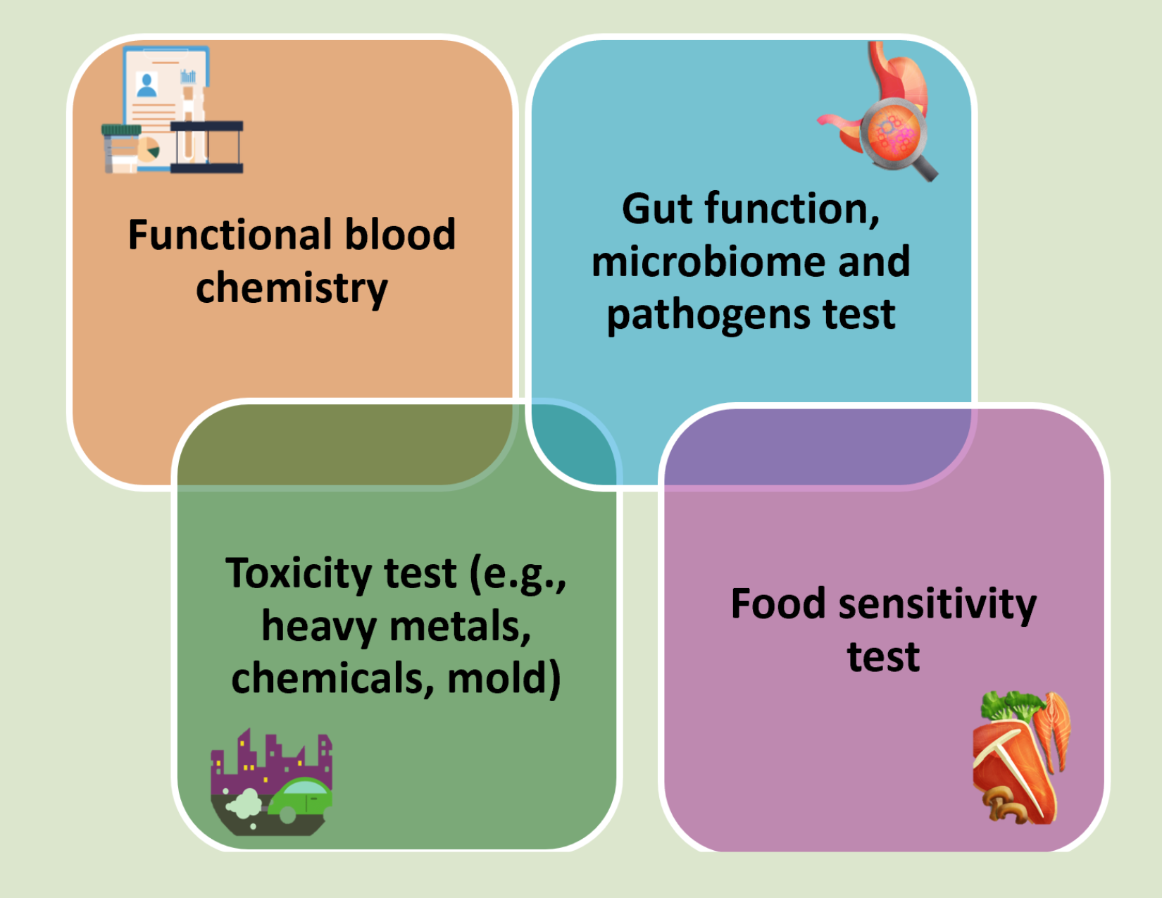 Investigative tools: Comprehensive health intake & questionnaires, advanced functional lab testing, and bioenergetic assessments.